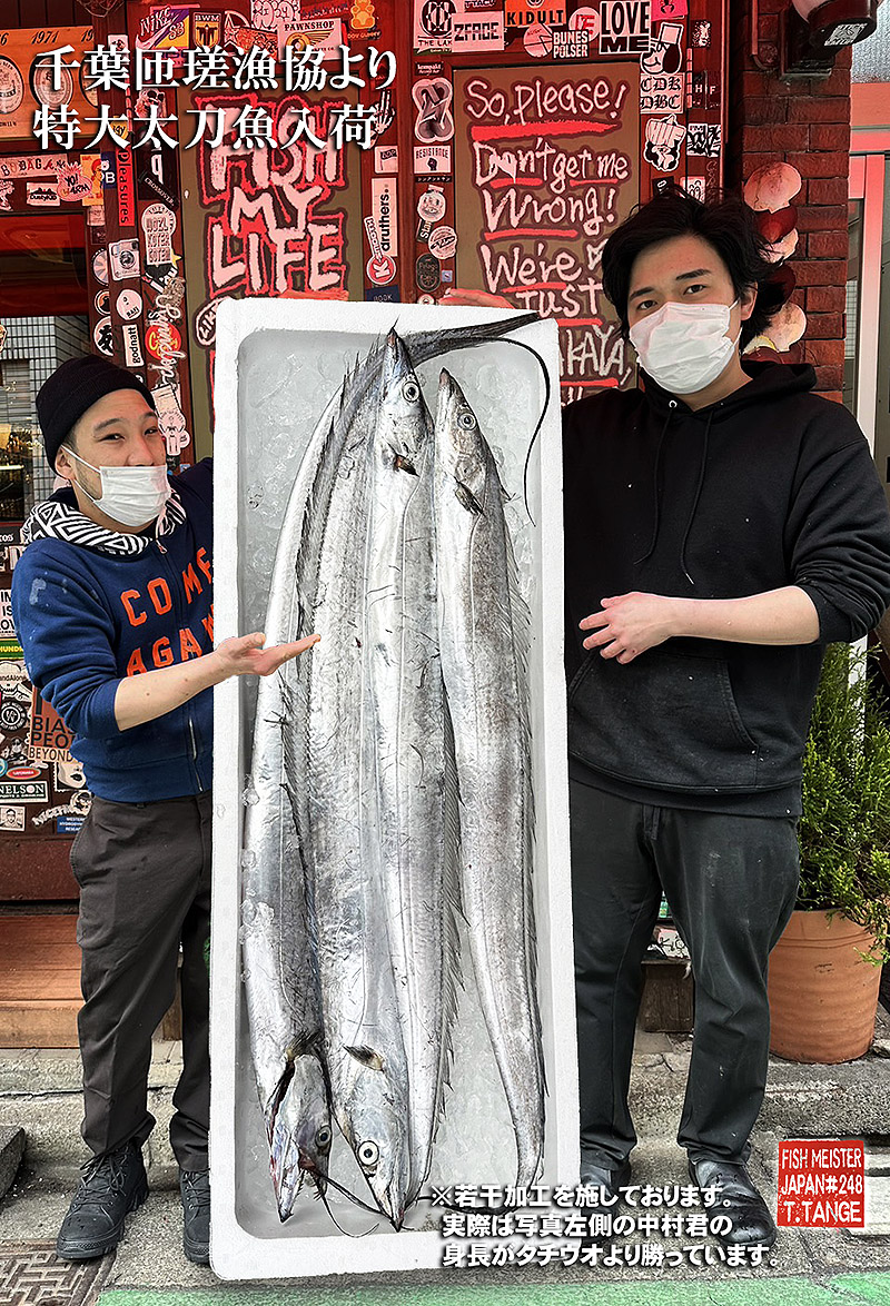 Oversized "Pacific Cutlassfish" received from the fishing cooperative in Sosa City, Chiba Prefecture. Sosa is a surf city with numerous surf points such as Horikawa beach, Imaizumi, Note beach, and Yoshizaki beach. There are thigh- to belly-sized waves at almost any time of day, and a type of dolphin, the "Finless porpoise" sometimes rubs up against the legs of waiting for a wave in the sea. I am already too old to go into the cold sea water these days from late fall to early summer, but I thought for a moment that I would go SUP if I could catch such a fine Cutlassfish, but the mere thought gave me goosebumps, so I will not do that.